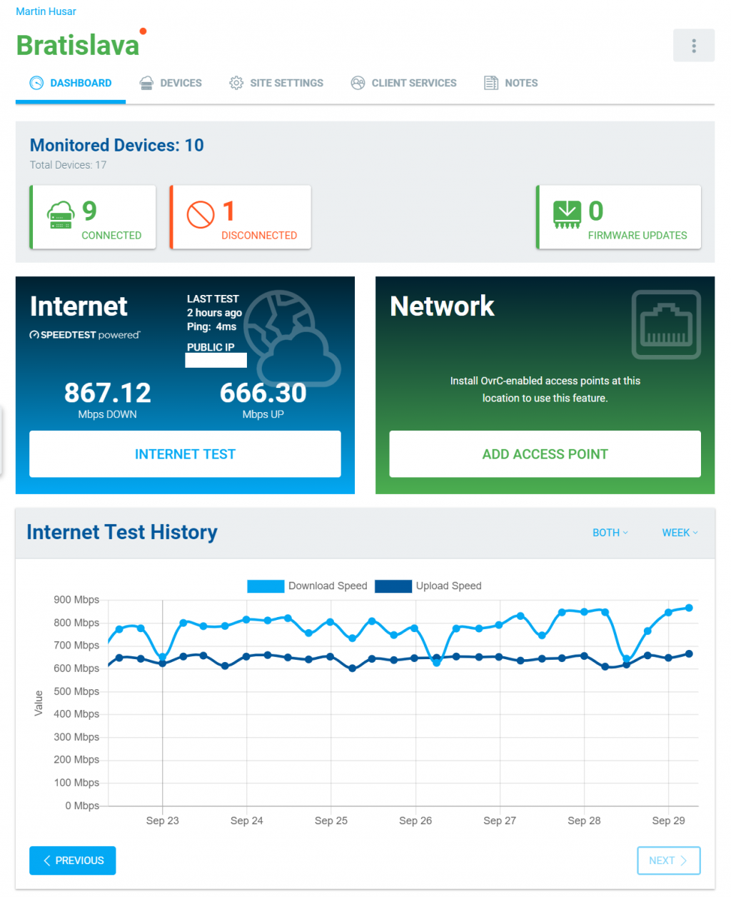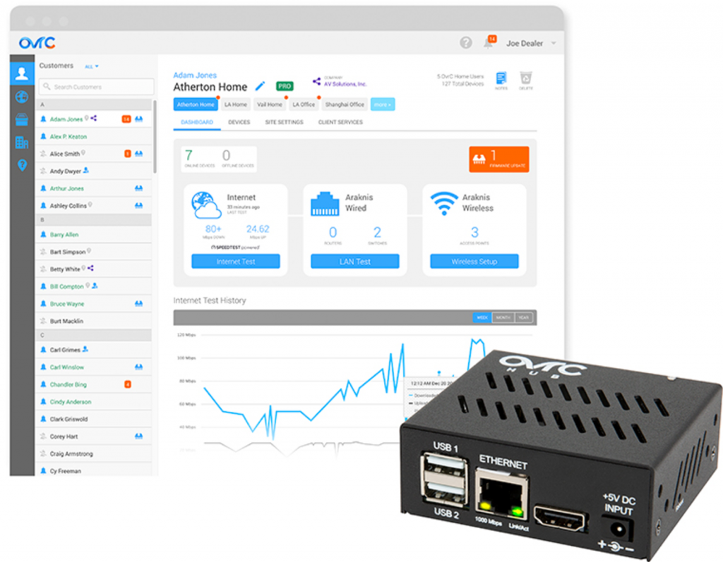 Ovrc Pro je automatizované riešenie na monitorovanie siete s prehľadnou bezplatnou aplikáciou a webovým rozhraním. Dokáže pravidelne merať rýchlosť internetu a vykresľovať výsledky v prehľadnom grafe. Monitoruje aj výpadky zariadení v miestnej sieti, na ktoré vás upozorní pomocou oznámenia PUSH na váš mobilný telefón. Okrem toho ponúka vzdialené ovládanie a reštartovanie vybraných zariadení (TV, PoE prepínače, IP zásuvky, ...).